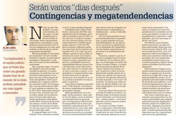 En definitiva, para Uruguay puede representar a la larga una gran oportunidad. Habrá que atravesar el oscuro túnel de 2020, con sus secuelas hacia 2021, pero al final parece haber luces ligadas no sólo a una coyuntura mundial más favorable, sino con megatendencias globales positivas para una economía pequeña y alejada de los centros mundiales de alto poder adquisitivo.