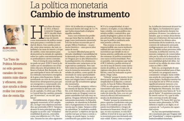 Para avanzar en esa dirección es imprescindible una nueva institucionalidad del ente emisor, con las características que detallé en mi columna anterior, publicada acá, hace dos semanas. Pero en paralelo, más temprano que tarde, el BCU debería y podría retornar al uso de la tasa de interés como instrumento de política, en el marco de un régimen más pleno de metas de inflación, como ha insinuado su presidente, Diego Labat.