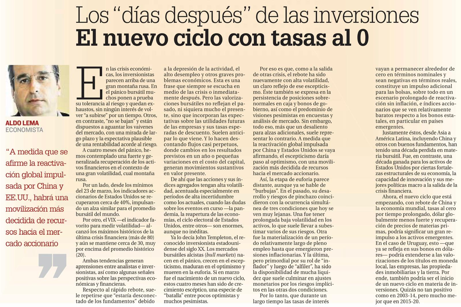 Ahora, el nuevo ciclo que está empezando, con rebote de China y la economía mundial, tasas al cero por tiempo prolongado, dólar globalmente menos fuerte y recuperación de precios de materias primas, podría significar un gran reimpulso a los activos emergentes. En el caso de Uruguay, esto -que ya se refleja en sus bonos en dólares- podría extenderse a las valorizaciones de los títulos en moneda local, las empresas, las propiedades inmobiliarias y la tierra. Por ende, también podría ser el inicio de un nuevo ciclo en materia de inversiones. Quizás no tan positivo como en 2003-14, pero mucho mejor que en 2015-20.