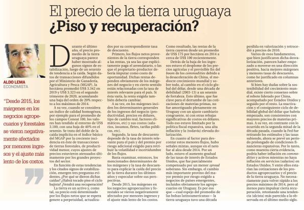 En cuanto al factor para descontar estos menores flujos hubo señales mixtas, aunque en el neto fue al alza desde 2014. Por un lado, estuvo el aumento gradual de las tasas de interés de Estados Unidos, que fue parcialmente compensado por un menor spread soberano. Sin embargo, el cambio más importante provino del mayor premio por riesgo exigido a negocios de países emergentes, incluidos obviamente los agropecuarios en Uruguay. Es por eso que -cual espejo del promedio de las bolsas latinoamericanas- la tierra uruguaya tuvo una década perdida en valorización y retrocedió a precios de 2010.