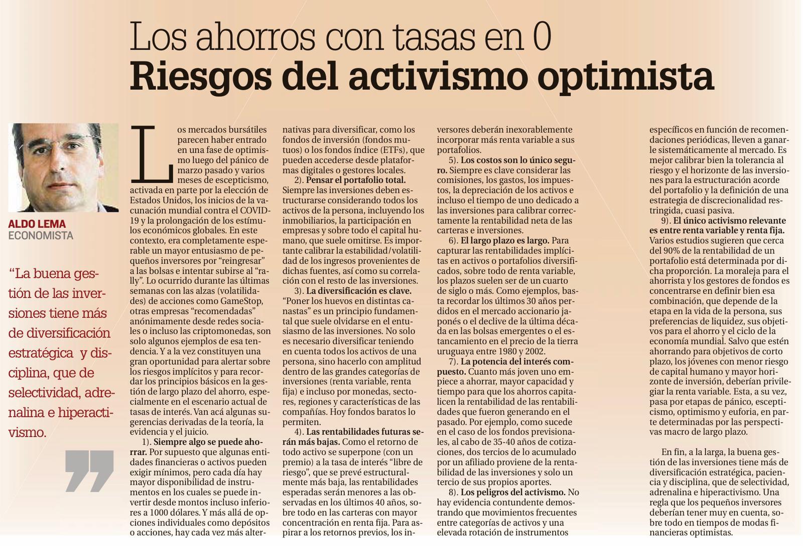 Lo ocurrido durante las últimas semanas con las alzas (volatilidades) de acciones como Game Stop, otras empresas “recomendadas” anónimamente desde redes sociales o incluso las criptomonedas, son solo algunos ejemplos de esa tendencia. Y a la vez constituyen una gran oportunidad para alertar sobre los riesgos implícitos y para recordar los principios básicos en la gestión de largo plazo del ahorro, especialmente en el escenario actual de tasas de interés. Van acá algunas sugerencias derivadas de la teoría, la evidencia y el juicio.