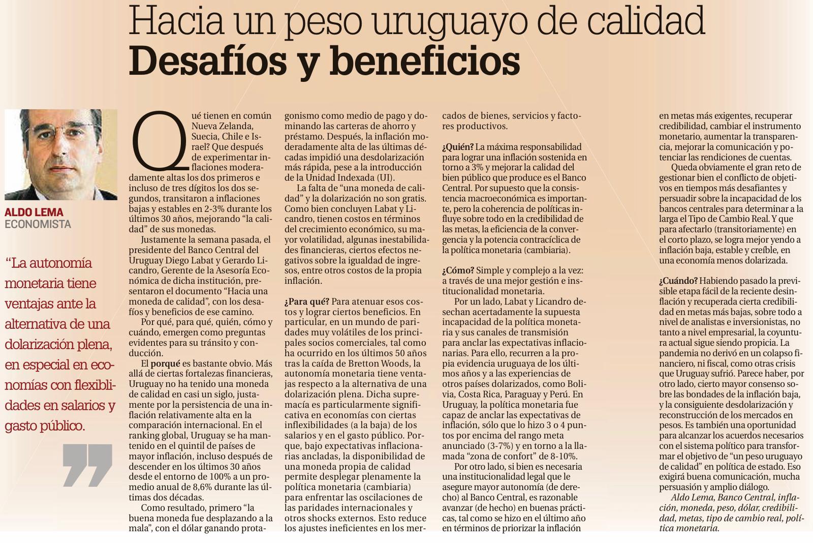 Habiendo pasado la previsible etapa fácil de la reciente desinflación y recuperada cierta credibilidad en metas más bajas, sobre todo a nivel de analistas e inversionistas, no tanto a nivel empresarial, la coyuntura actual sigue siendo propicia. La pandemia no derivó en un colapso financiero, ni fiscal, como otras crisis que Uruguay sufrió. Parece haber, por otro lado, cierto mayor consenso sobre las bondades de la inflación baja, y la consiguiente desdolarización y reconstrucción de los mercados en pesos. Es también una oportunidad para alcanzar los acuerdos necesarios con el sistema político para transformar el objetivo de “un peso uruguayo de calidad” en política de Estado. Eso exigirá buena comunicación, mucha persuación y amplio diálogo.