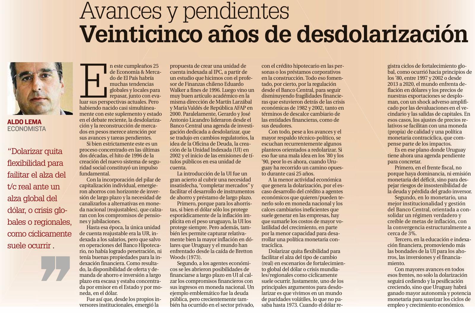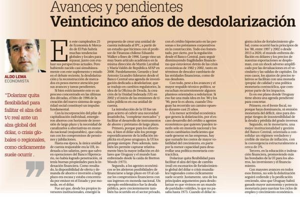 Con todo, pese a los avances y el mayor respaldo técnico-político, se escuchan recurrentemente algunos planteos orientados a redolarizar. Si eso fue una mala idea en los ’80 y los ’90, peor lo es ahora, cuando Uruguay ha recorrido un camino opuesto durante casi 25 años.