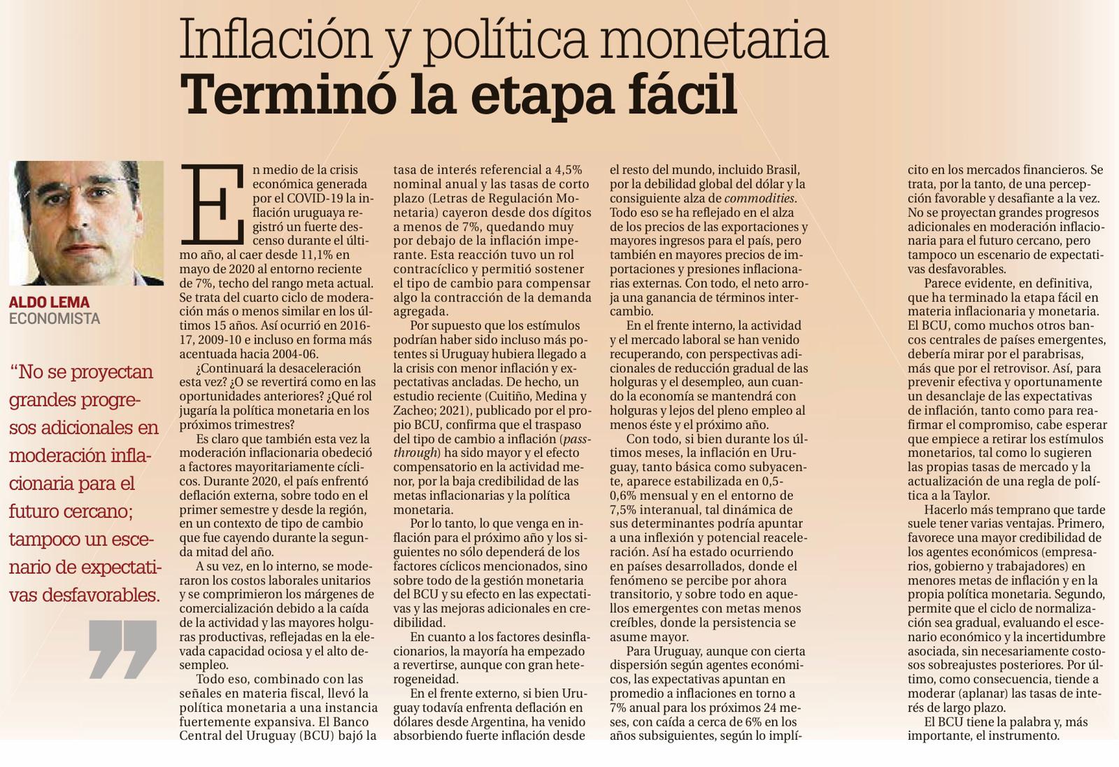 Parece evidente, en definitiva, que ha terminado la etapa fácil en materia inflacionaria y monetaria. El BCU, como muchos otros bancos centrales de países emergentes, debería mirar por el parabrisas, más que por el retrovisor. Así, para prevenir efectiva y oportunamente un desanclaje de las expectativas de inflación, así como para reafirmar el compromiso con menores metas, cabe esperar que empiece a retirar los estímulos monetarios, tal como lo sugieren las propias tasas de mercado y la actualización de una regla de política a la Taylor.