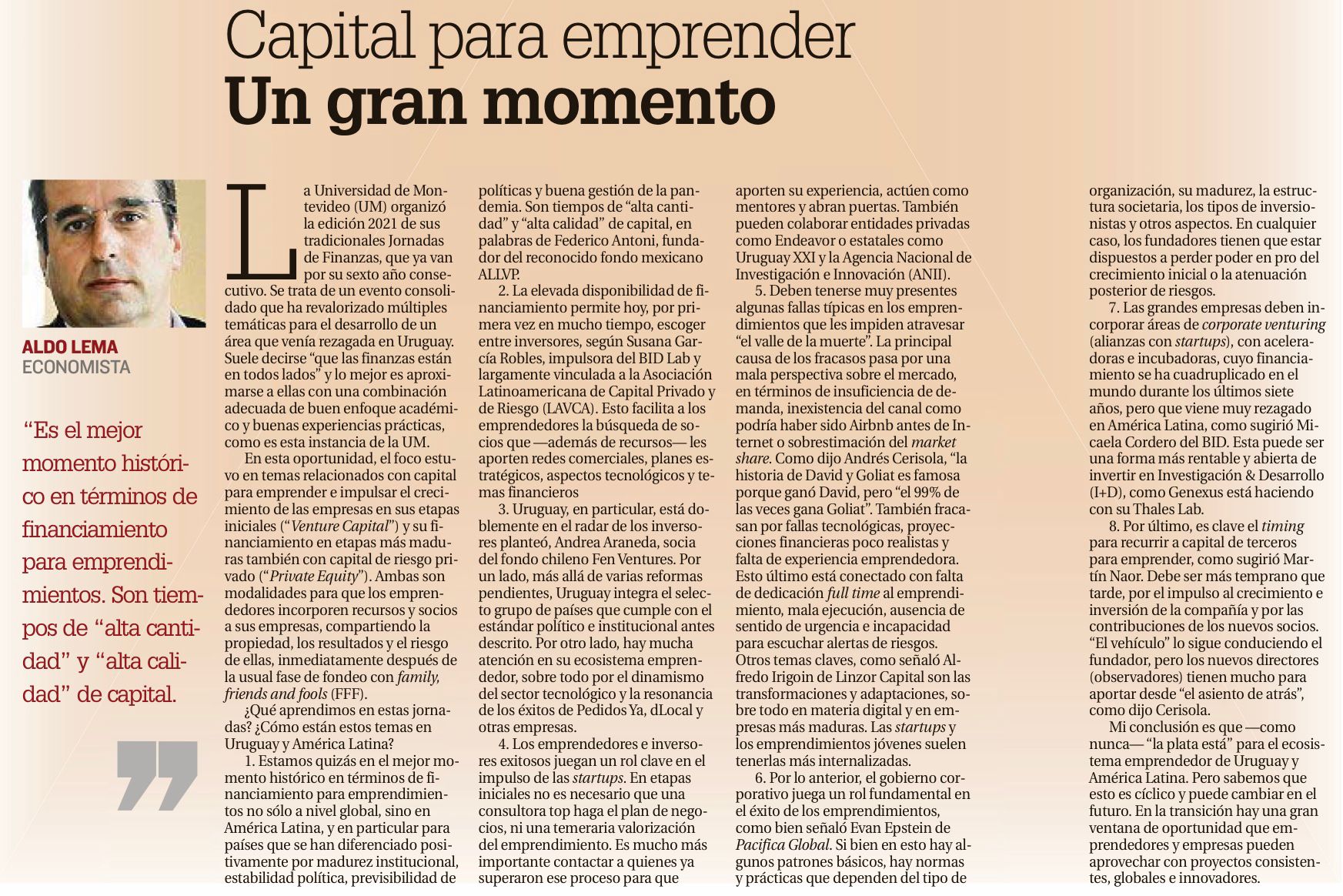 Mi conclusión es que -como nunca- “la plata está” para el ecosistema emprendedor de Uruguay y América Latina. Pero sabemos que esto es cíclico y puede cambiar en el futuro. En la transición hay una gran ventana de oportunidad que emprendedores y empresas pueden aprovechar con proyectos consistentes, globales e innovadores.