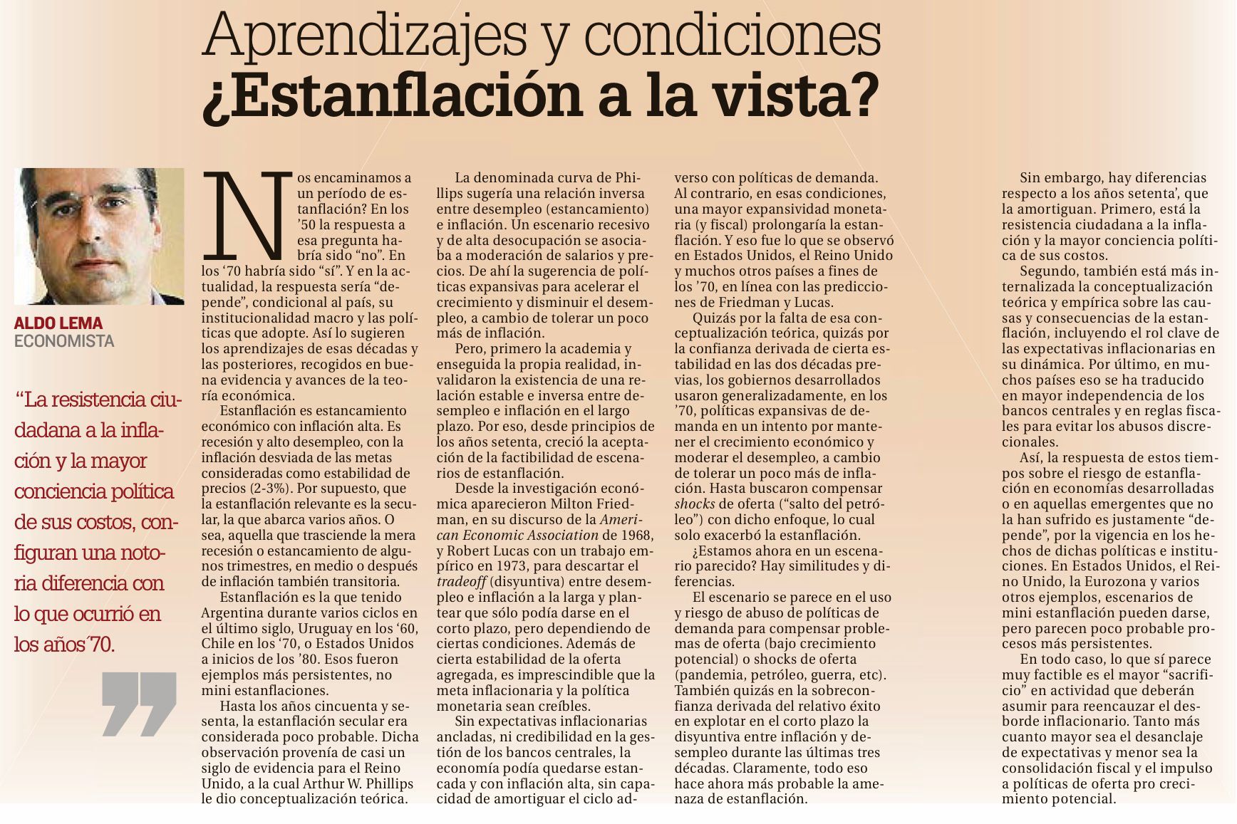 Estanflación es la que tenido Argentina durante varios ciclos en el último siglo, Uruguay en los ‘60, Chile en los ‘70, o Estados Unidos a inicios de los ’80. Esos fueron ejemplos más persistentes, no mini estanflaciones.
