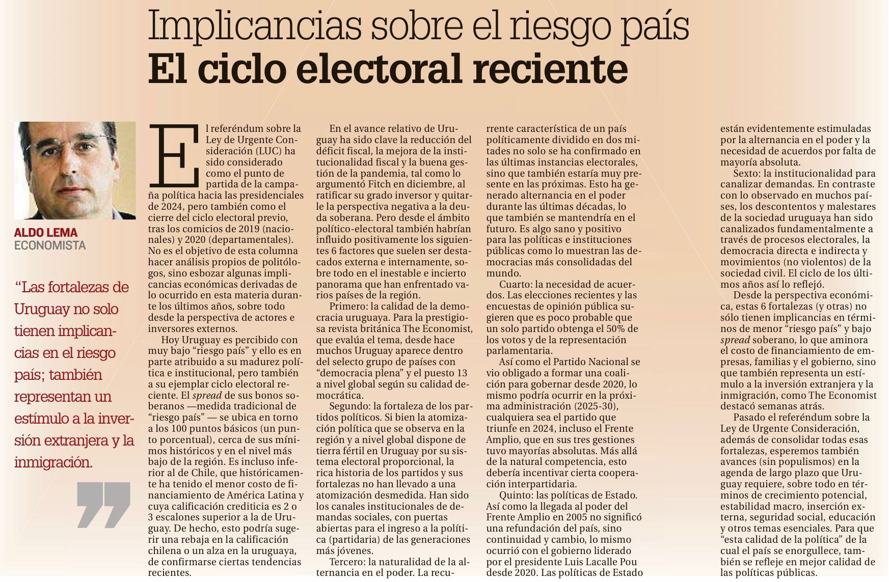 El referéndum sobre la Ley de Urgente Consideración (LUC) ha sido considerado como el punto de partida de la campaña política hacia las presidenciales de 2024, pero también como el cierre del ciclo electoral previo, tras los comicios de 2019 (nacionales) y 2020 (departamentales). No es el objetivo de esta columna hacer análisis propios de politólogos, sino esbozar algunas implicancias económicas derivadas de lo ocurrido en esta materia durante los últimos años, sobre todo desde la perspectiva de actores e inversores externos.