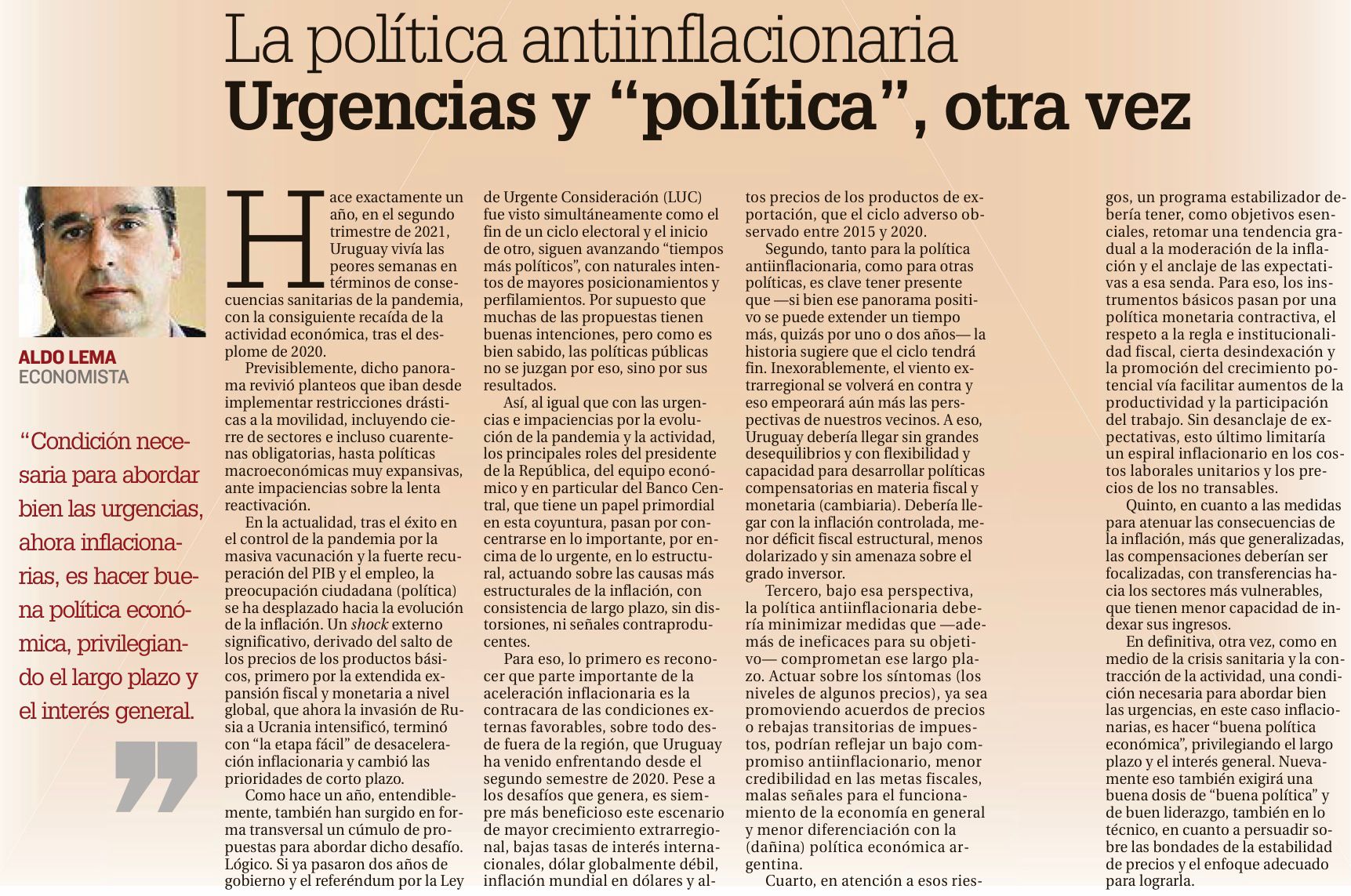 Hace exactamente un año, en el segundo trimestre de 2021, Uruguay vivía las peores semanas en términos de consecuencias sanitarias de la pandemia, con la consiguiente recaída de la actividad económica, tras el desplome de 2020. Previsiblemente, dicho panorama revivió planteos que iban desde implementar restricciones drásticas a la movilidad, incluyendo cierre de sectores e incluso cuarentenas obligatorias, hasta políticas macroeconómicas muy expansivas, ante impaciencias sobre la lenta reactivación.