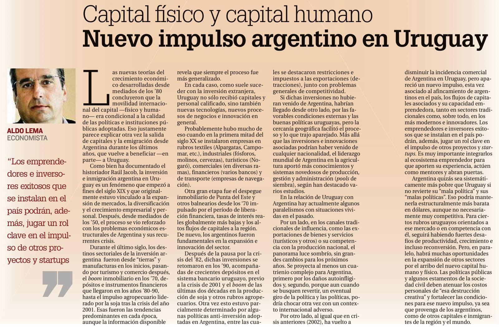 Las nuevas teorías del crecimiento económico desarrolladas desde mediados de los ’80 concluyeron que la movilidad internacional del capital -físico y humano- era condicional a la calidad de las políticas e instituciones públicas adoptadas. Eso justamente parece explicar otra vez la salida de capitales y la emigración desde Argentina durante los últimos años, que vuelve a beneficiar -en parte- a Uruguay.