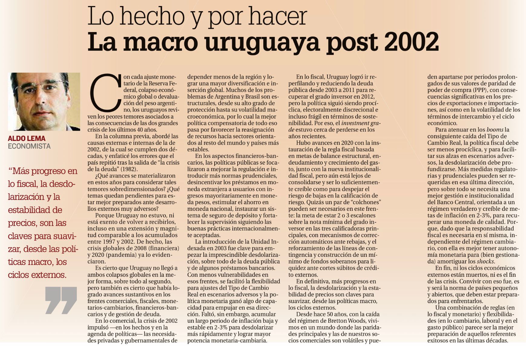 Es cierto que Uruguay no llegó a ambos colapsos globales en la mejor forma, sobre todo al segundo, pero también es cierto que había logrado avances sustantivos en los frentes comerciales, fiscales, monetarios-cambiarios, financieros-bancarios y de gestión de deuda.