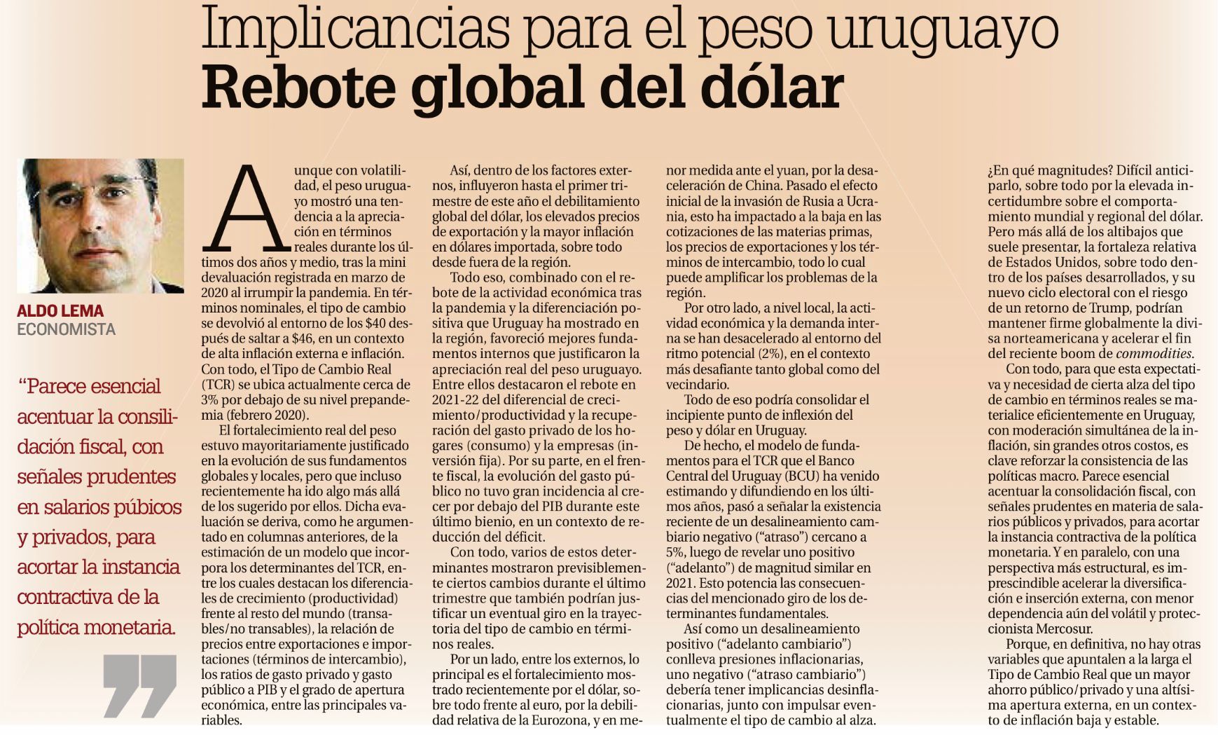 Con todo, para que esta expectativa y necesidad de cierta alza del tipo de cambio en términos reales se materialice eficientemente en Uruguay, con moderación simultánea de la inflación, sin grandes otros costos, es clave reforzar la consistencia de las políticas macro. Parece esencial acentuar la consolidación fiscal, con señales prudentes en materia de salarios públicos y privados, para acortar la instancia contractiva de la política monetaria. Y en paralelo, con una perspectiva más estructural, es imprescindible acelerar la diversificación e inserción externa, con menor dependencia aún del volátil y proteccionista Mercosur.