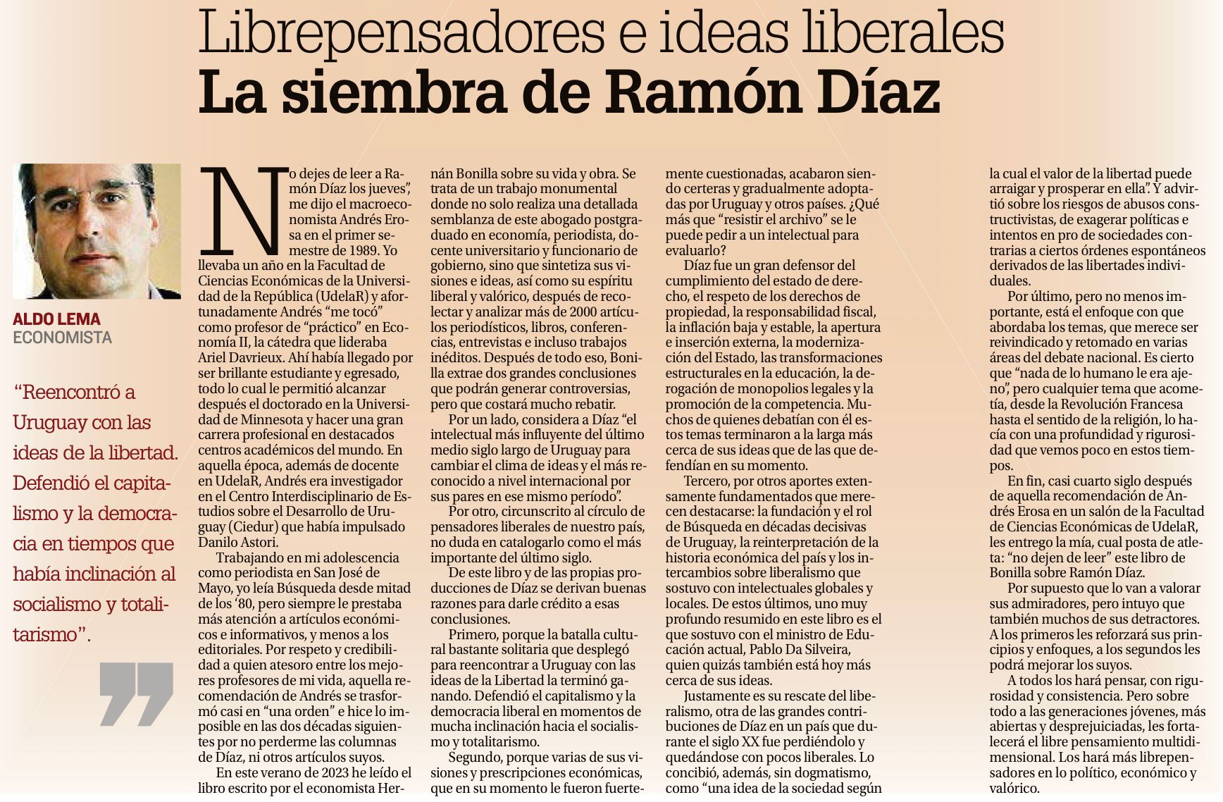 «No dejes de leer a Ramón Díaz los jueves» me dijo el macroeconomista Andrés Erosa en el primer semestre de 1989. Yo llevaba un año en la Facultad de Ciencias Económicas de la Universidad de la República (UdelaR) y afortunadamente Andrés “me tocó” como profesor de “práctico” en Economía II, la cátedra que lideraba Ariel Davrieux. Ahí había llegado por ser brillante estudiante y egresado, todo lo cual le permitió alcanzar después el doctorado en la Universidad de Minnesota y hacer una gran carrera profesional en destacados centros académicos del mundo. En aquella época, además de docente en UdelaR, Andrés era investigador en el Centro Interdisciplinario de Estudios sobre el Desarrollo de Uruguay (CIEDUR) que había impulsado Danilo Astori.