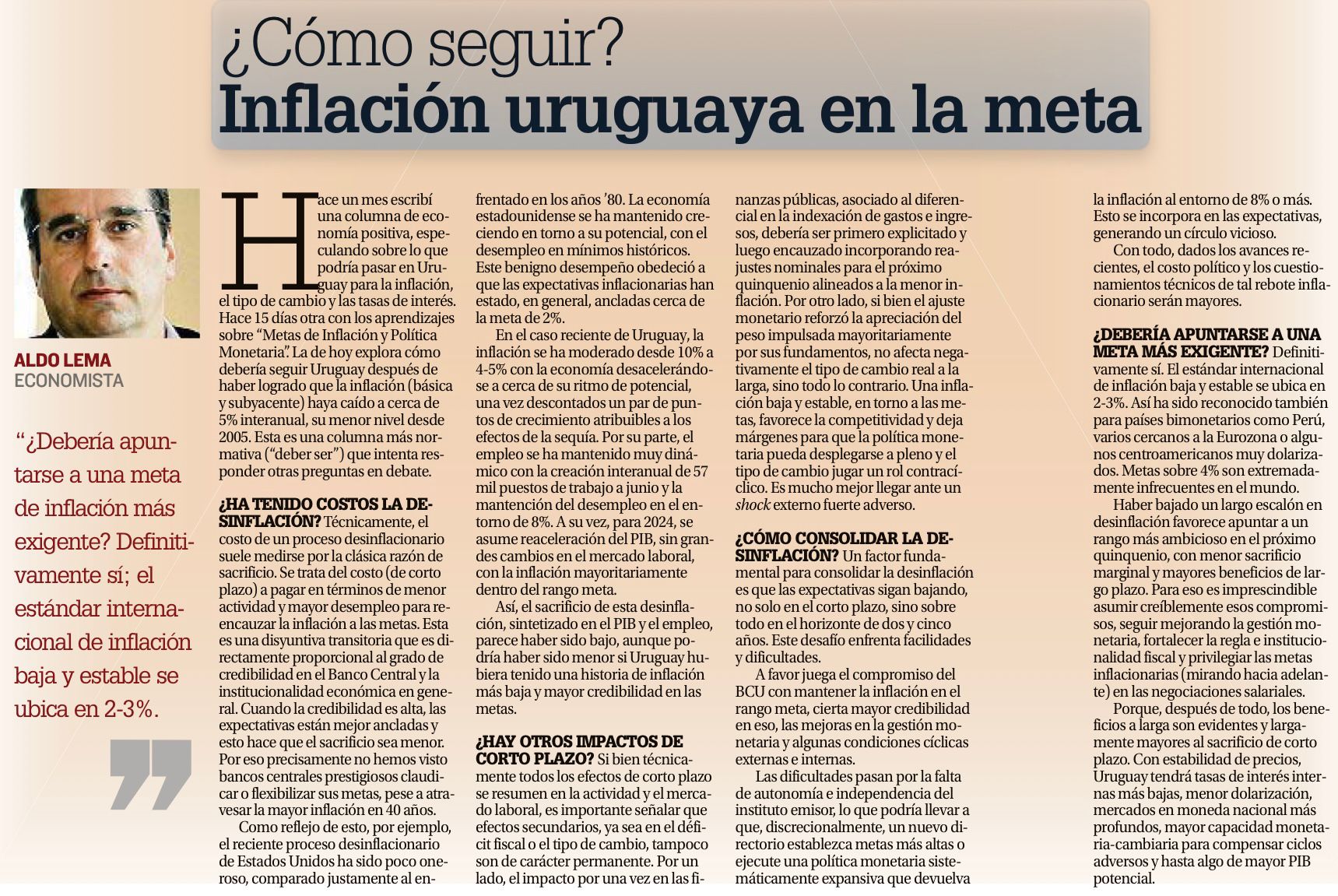 Hace un mes escribí una columna de economía positiva especulando sobre lo que podría pasar en Uruguay para la inflación, el tipo de cambio y las tasas de interés. Hace 15 días otra con los aprendizajes sobre “Metas de Inflación y Política Monetaria”. La de hoy explora cómo debería seguir Uruguay después de haber logrado que la inflación (básica y subyacente) haya caído a cerca de 5% interanual, su menor nivel desde 2005. Esta es una columna más normativa (“deber ser”) que intenta responder otras preguntas en debate.