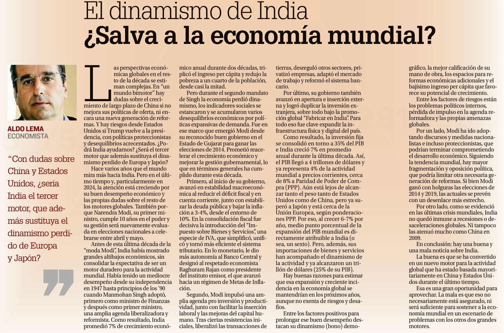 Las perspectivas económicas globales en el resto de la década se estiman complejas. En “un mundo bimotor” hay dudas sobre el crecimiento de largo plazo de China si no mejora sus políticas de oferta, ni encara una nueva generación de reformas. Y hay riesgos desde Estados Unidos si Trump vuelve a la presidencia, con políticas proteccionistas y desequilibrios acrecentados. ¿Podrá India ayudarnos? ¿Será el tercer motor que además sustituye el dinamismo perdido de Europa y Japón?