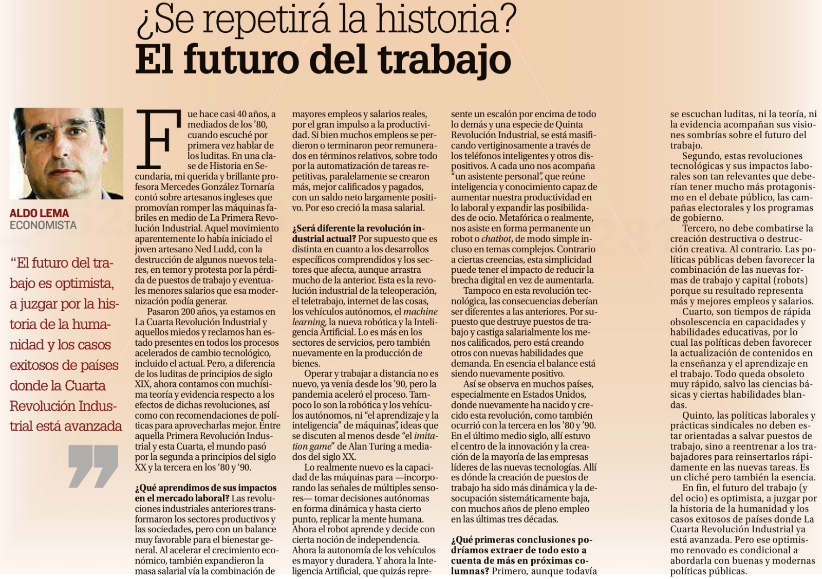 En fin, el futuro del trabajo (y del ocio) es optimista, a juzgar por la historia de la humanidad y los casos exitosos de países donde La Cuarta Revolución Industrial ya está avanzada. Pero ese optimismo renovado es condicional a abordarla con buenas y modernas políticas públicas.