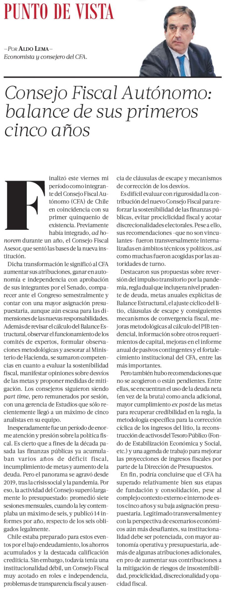 Finalizó el viernes 17 de mayo de 2024 mi período como integrante del Consejo Fiscal Autónomo (CFA) de Chile en coincidencia con su primer quinquenio de existencia. Previamente había integrado, ad honorem durante un año, el Consejo Fiscal Asesor, que sentó las bases de la nueva institución.