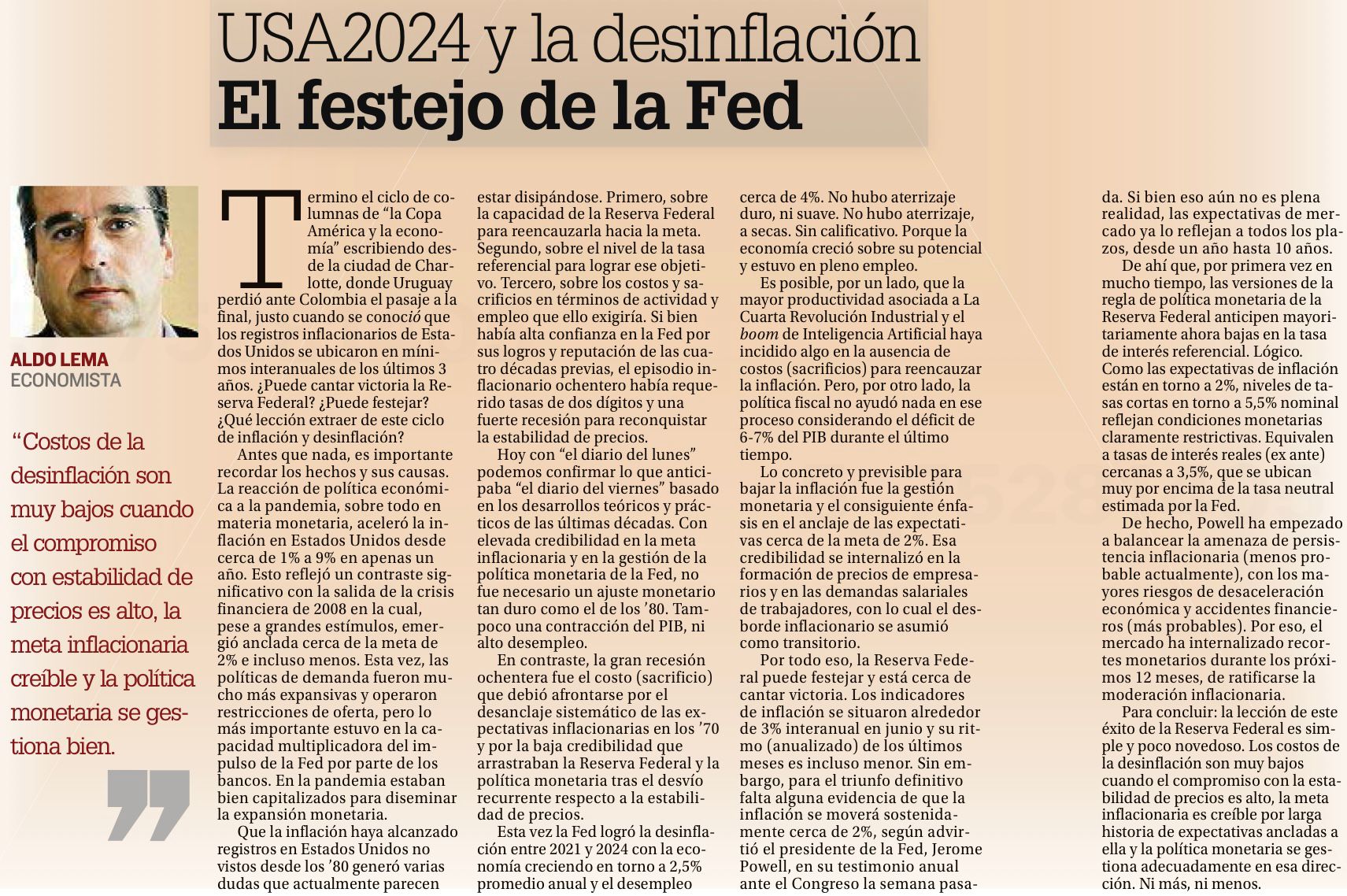 Para concluir: la lección de este éxito de la Reserva Federal es simple y poco novedoso. Los costos de la desinflación son muy bajos cuando el compromiso con la estabilidad de precios es alto, la meta inflacionaria es creíble por larga historia de expectativas ancladas a ella y la política monetaria se gestiona adecuadamente en esa dirección. Ni más, ni menos.