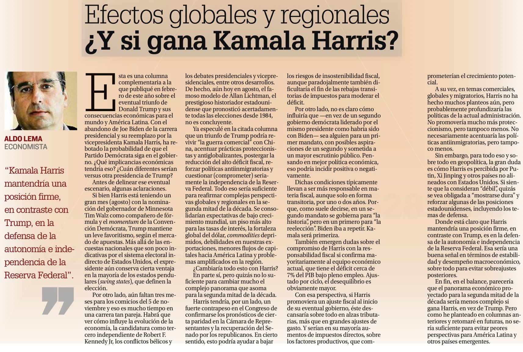 Donde está claro que Harris mantendría una posición firme, en contraste con Trump, es en la defensa de la autonomía e independencia de la Reserva Federal. Esa sería una buena señal en términos de estabilidad y desempeño macroeconómico, sobre todo para evitar sobreajustes posteriores.