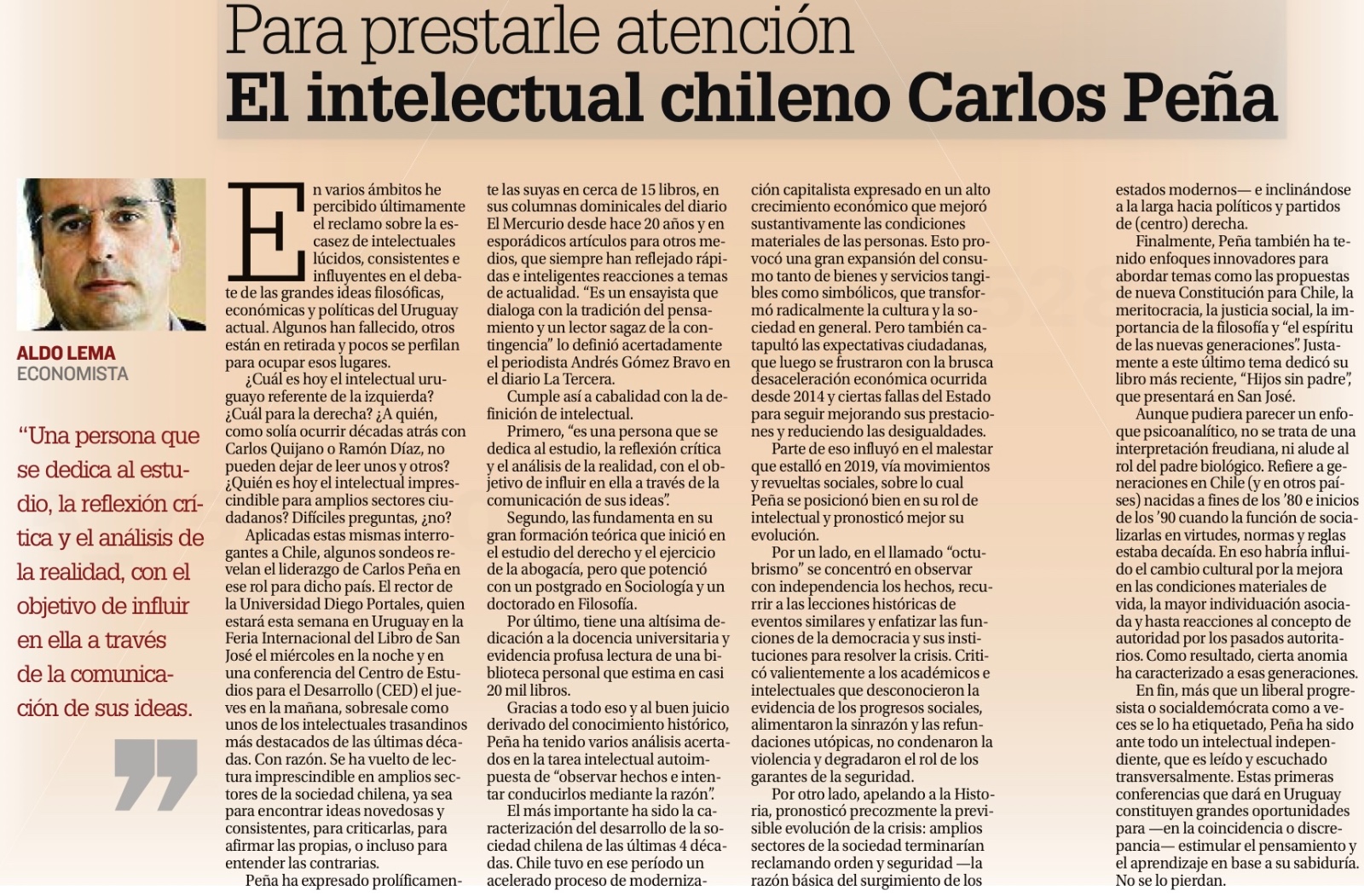 Aplicadas estas mismas interrogantes a Chile, algunos sondeos revelan el liderazgo de Carlos Peña en ese rol para dicho país. El rector de la Universidad Diego Portales, quien estará esta semana en Uruguay en la Feria Internacional del Libro de San José el miércoles en la noche y en una conferencia del Centro de Estudios para el Desarrollo (CED) el jueves en la mañana, sobresale como unos de los intelectuales trasandinos más destacados de las últimas décadas. Con razón. Se ha vuelto de lectura imprescindible en amplios sectores de la sociedad chilena, ya sea para encontrar ideas novedosas y consistentes, para criticarlas, para afirmar las propias, o incluso para entender las contrarias.