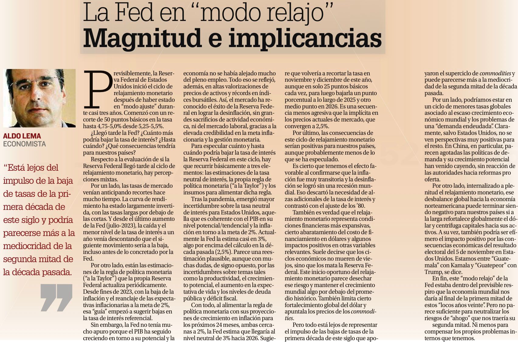Por otro lado, internalizado a plenitud el relajamiento monetario, ese desbalance global hacia la economía norteamericana puede terminar siendo negativo para nuestros países si a la larga refortalece globalmente el dólar y centrifuga capitales hacia sus activos. A su vez, también podría ser efímero el impacto positivo por las consecuencias económicas del resultado electoral del 5 de noviembre en Estados Unidos. Estamos entre “Guatemala” con Kamala y “Guatepeor” con Trump, se dice.