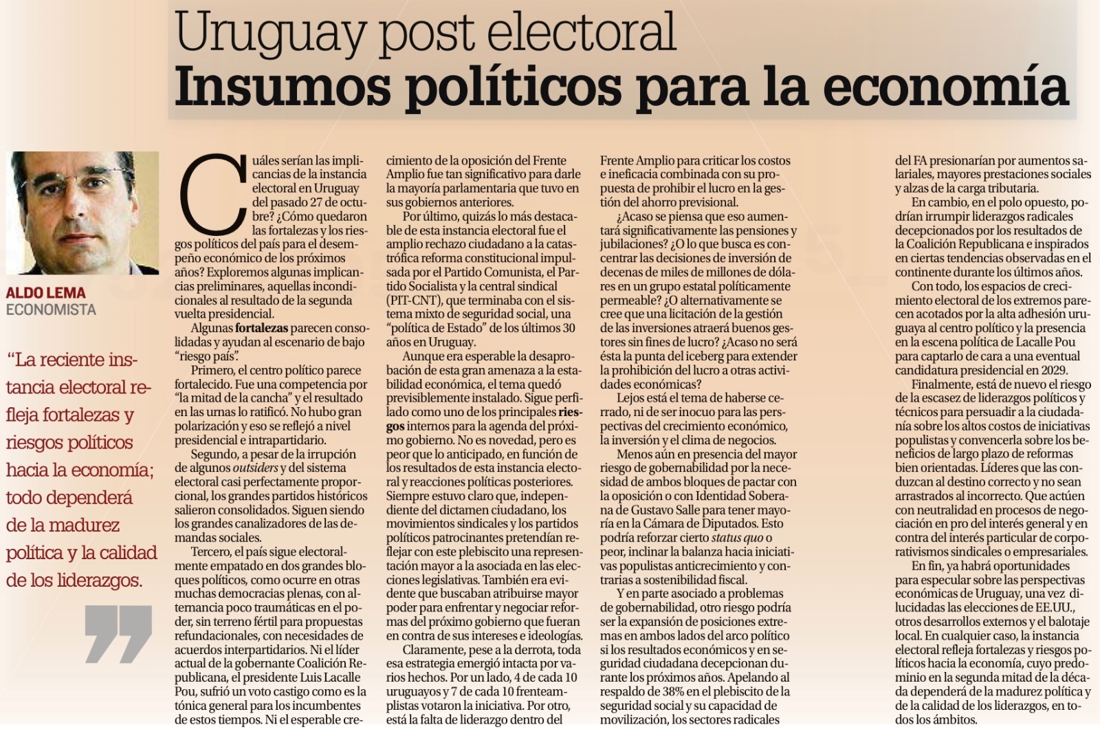 En fin, ya habrá oportunidades para especular sobre las perspectivas económicas de Uruguay, una vez dilucidadas las elecciones de Estados Unidos, otros desarrollos externos y el balotaje local. En cualquier caso, la reciente instancia electoral refleja fortalezas y riesgos políticos hacia la economía, cuyo predominio en la segunda mitad de la década dependerá de la madurez política y de la calidad de los liderazgos, en todos los ámbitos.