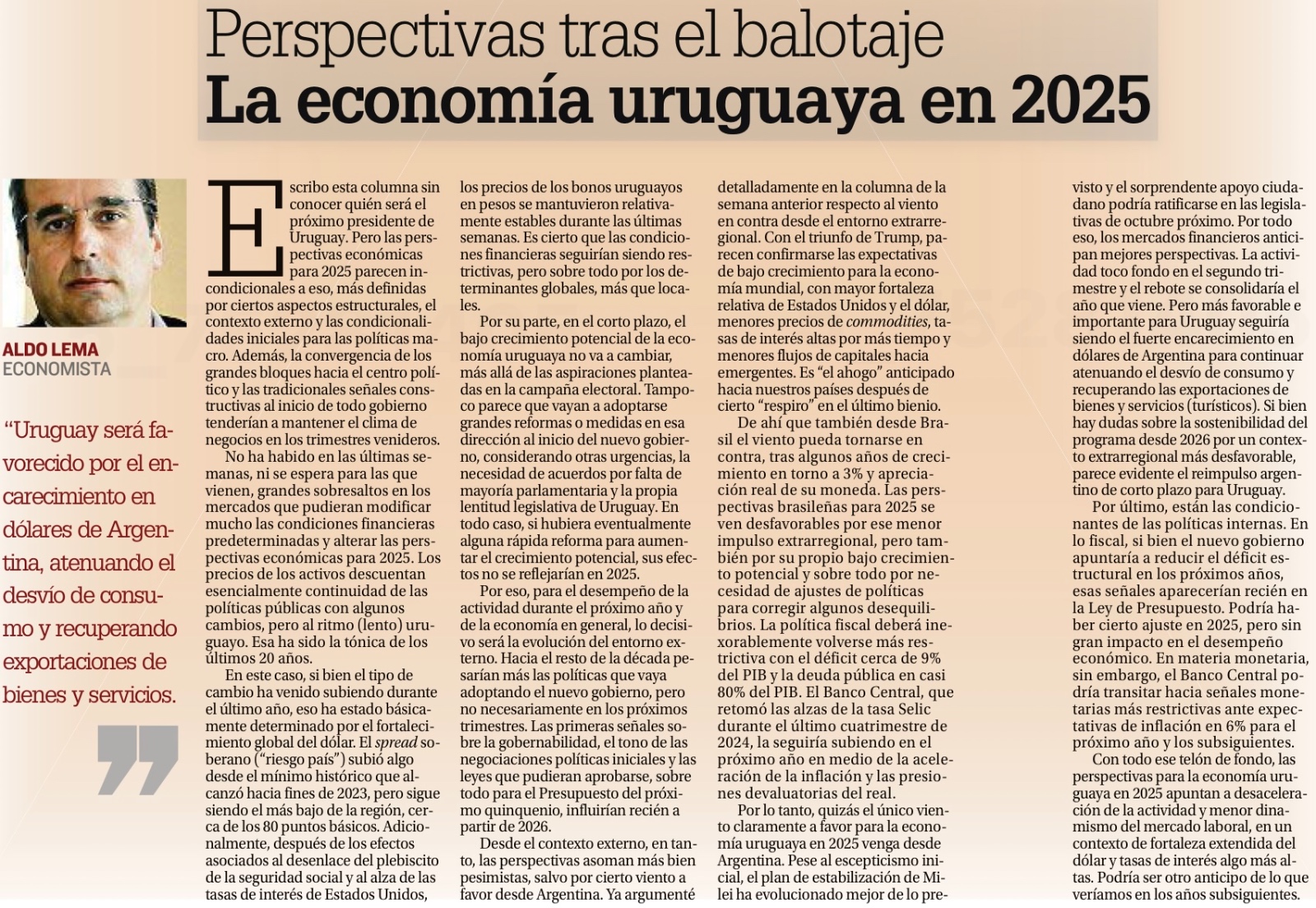 Escribo esta columna sin conocer quién será el próximo presidente de Uruguay. Pero las perspectivas económicas para 2025 parecen incondicionales a eso, más definidas por ciertos aspectos estructurales, el contexto externo y las condicionalidades iniciales para las políticas macro. Además, la convergencia de los grandes bloques hacia el centro político y las tradicionales señales constructivas al inicio de todo gobierno tenderían a mantener el clima de negocios en los trimestres venideros.