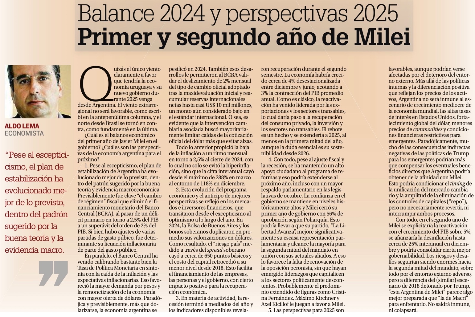 Todo lo anterior propició la baja de la inflación a un ritmo mensual en torno a 2,5% al cierre de 2024, con lo cual no solo se evitó la hiperinflación, sino que la cifra interanual cayó desde el máximo de 288% en marzo al entorno de 118% en diciembre.