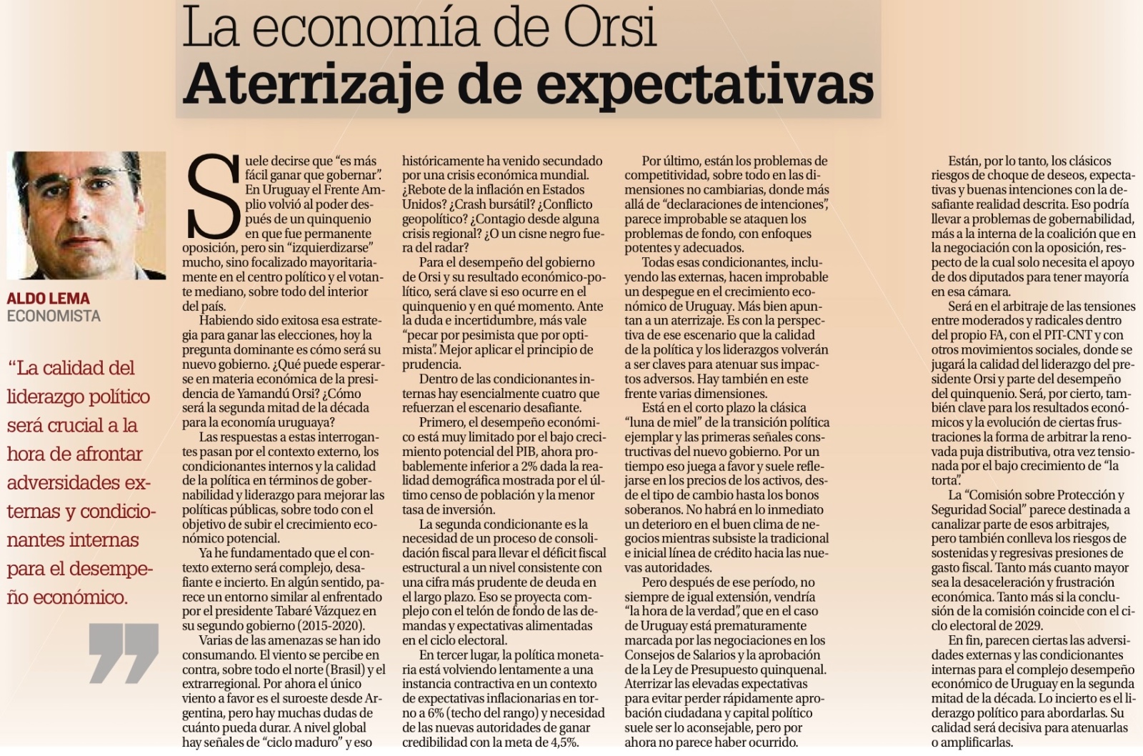 Habiendo sido exitosa esa estrategia para ganar las elecciones, hoy la pregunta dominante es cómo será su nuevo gobierno. ¿Qué puede esperarse en materia económica de la presidencia de Yamandú Orsi? ¿Cómo será la segunda mitad de la década para la economía uruguaya?