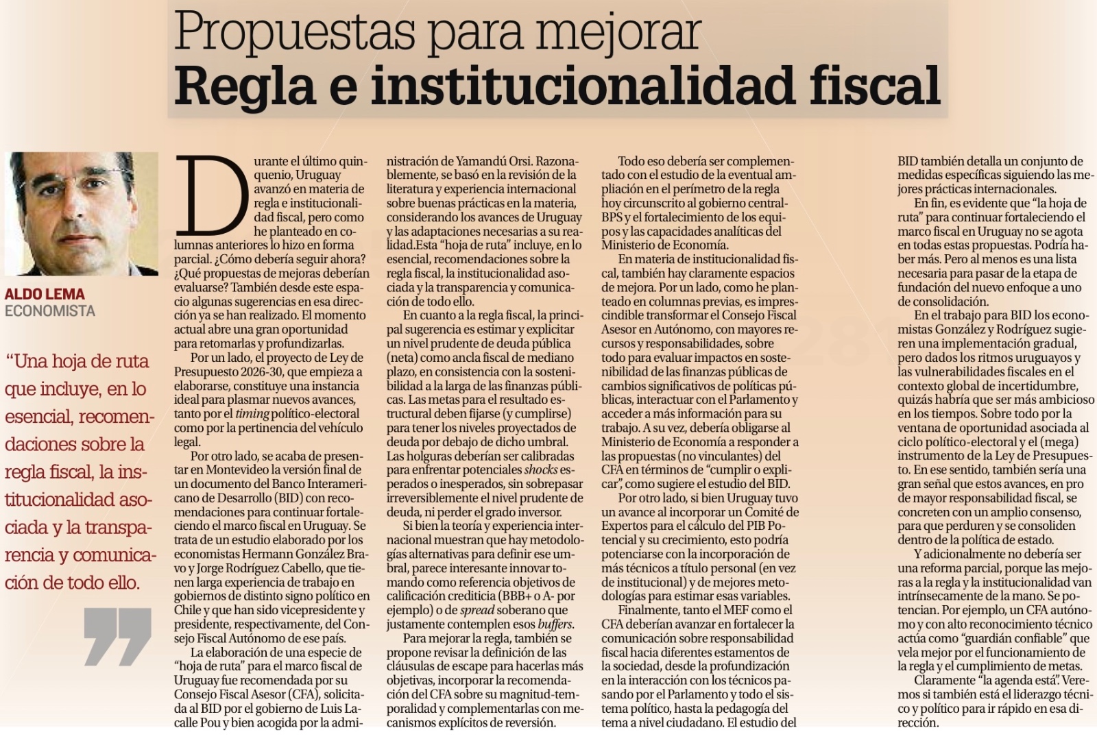 Por otro lado, se acaba de presentar en Montevideo la versión final de un documento del Banco Interamericano de Desarrollo (BID) con recomendaciones para continuar fortaleciendo el marco fiscal en Uruguay. Se trata de un estudio elaborado por los economistas Hermann González Bravo y Jorge Rodríguez Cabello, que tienen larga experiencia de trabajo en gobiernos de distinto signo político en Chile y que han sido vicepresidente y presidente, respectivamente, del Consejo Fiscal Autónomo de ese país.