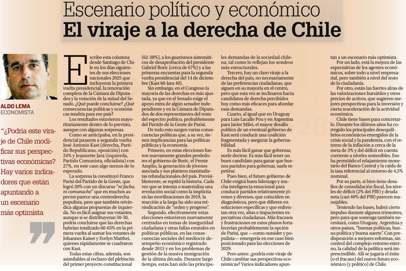 Escribo esta columna desde Santiago de Chile en los días siguientes de sus elecciones nacionales 2025 que incluyeron la primera vuelta presidencial, la renovación completa de la Cámara de Diputados y la votación de la mitad del Senado. ¿Qué puede concluirse? ¿Qué consecuencias políticas y económicas tendría para ese país?