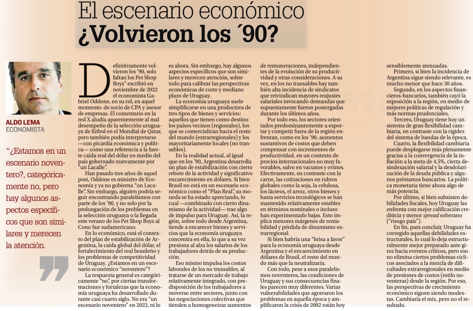 “Definitivamente volvieron los ’90, solo faltan los Pet Shop Boys” escribió en noviembre de 2022 el economista Gabriel Oddone, en su rol en aquel momento de socio de CPA y asesor de empresas. El comentario en la red X aludía aparentemente al mal desempeño de la selección uruguaya de fútbol en el Mundial de Qatar, pero también podía interpretarse -con picardía económica y política- como una referencia a la fuerte caída real del dólar en medio del país gobernado nuevamente por “un Lacalle”.