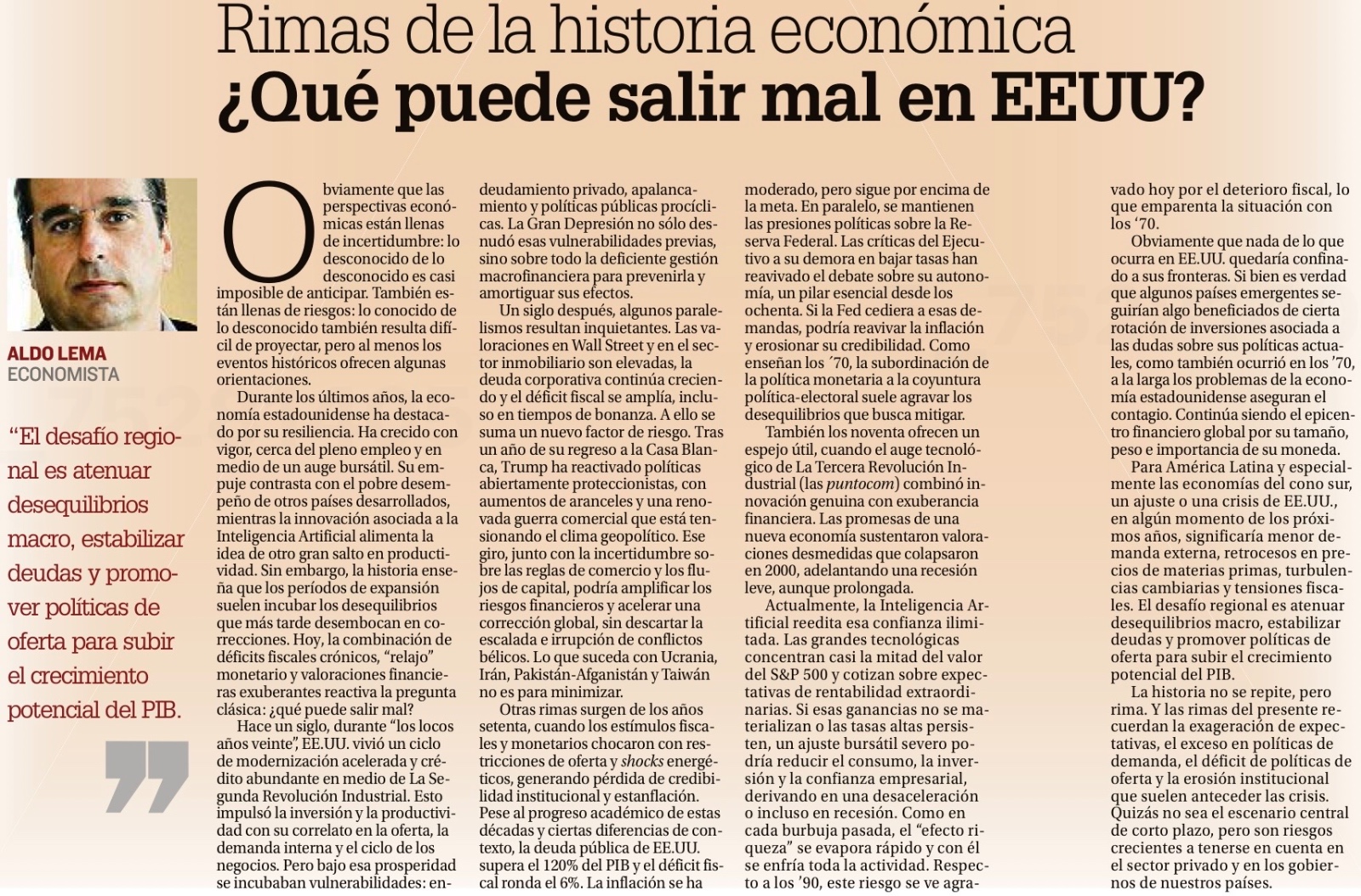Para América Latina y especialmente las economías del cono sur, un ajuste o una crisis de EE.UU. en algún momento de los próximos años significaría menor demanda externa, retrocesos en precios de materias primas, turbulencias cambiarias y tensiones fiscales. El desafío regional es atenuar desequilibrios macro, estabilizar deudas y promover políticas de oferta para subir el crecimiento potencial del PIB.